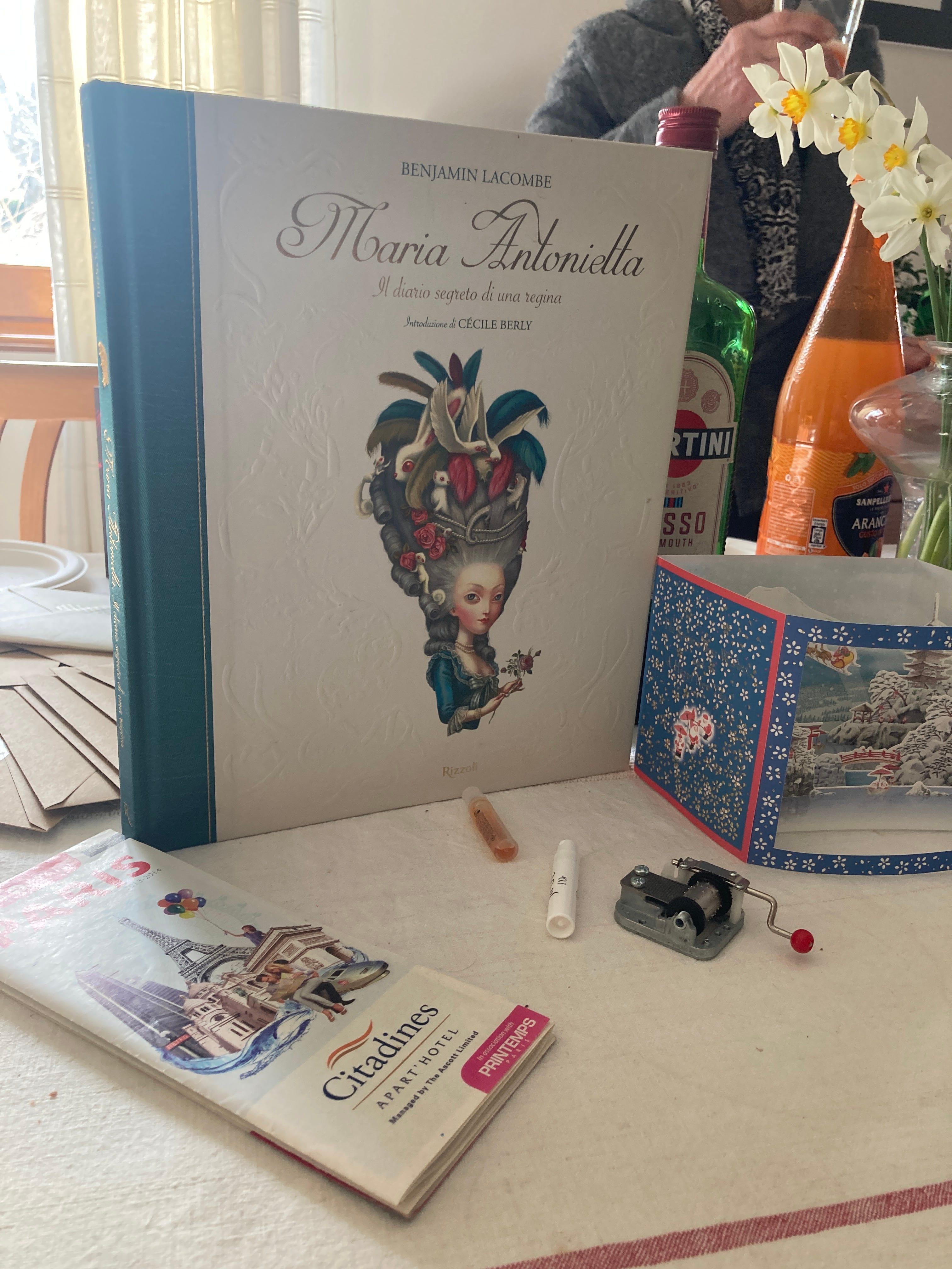 Abbiamo fatto una caccia al tesoro casalinga, dieci oggetti per ricordarti: il biglietto del giappone, la mappa di Parigi, un carillon, i tuoi mini profumi, un libro di Maria Antonietta.